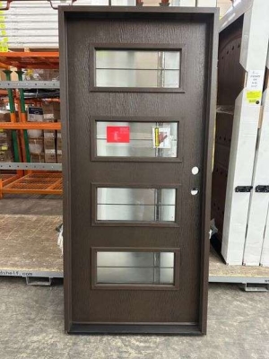 Dark Walnut, Exterior Fiberglass, 114A 4 Lite Deco Glass A, 36"x80", LH. By Sure Rock, 4-9/16" Jamb, BK Hardware, Net Frame: 37-1/4"x81"x4-9/16", Single, Oak Grain, Pre-Hung, Grade:2 Weight: 95. Sold by: Door. Sold as: Price x Quantity.