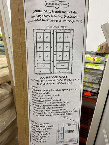 Exterior 6-Lite French Knotty Alder Door RH. Pre-Hung: 2 36"x80" Doors, Sill 5 9/16", Rough Opening: 75 3/4"Wx 83 1/4"H, Grade: 1st Weight: x. Sold by: Door. Sold as: Price x Quantity.