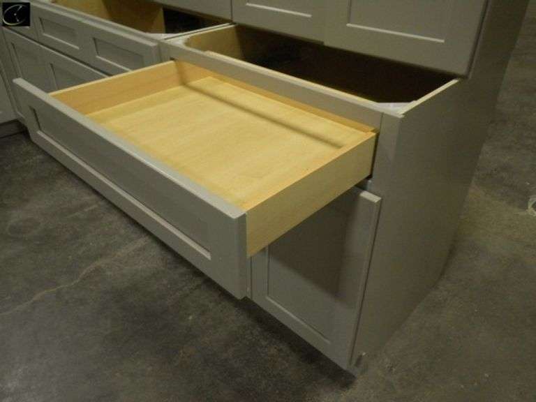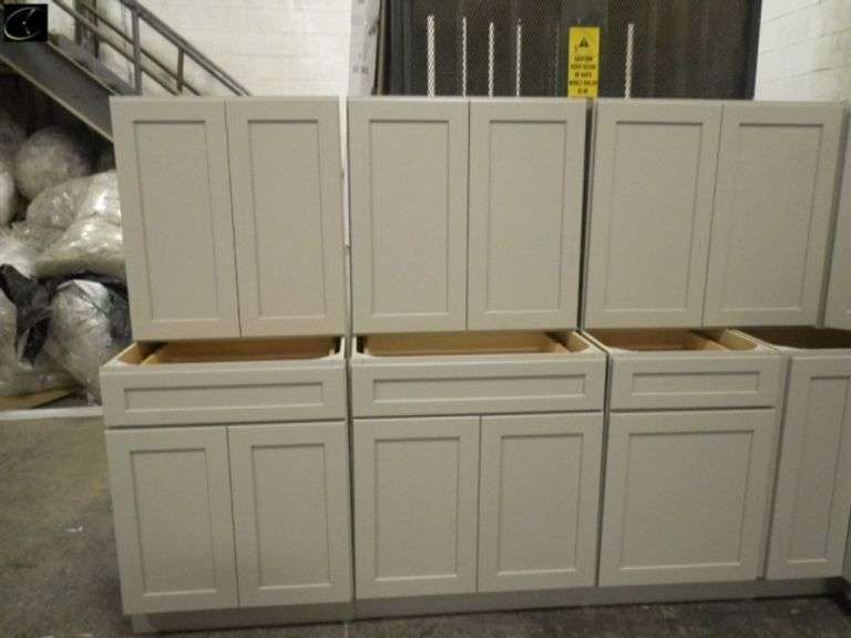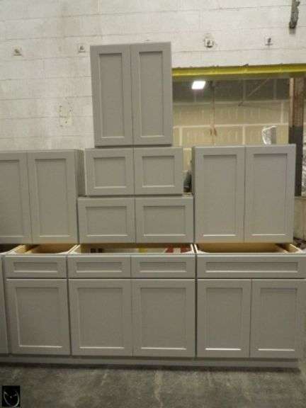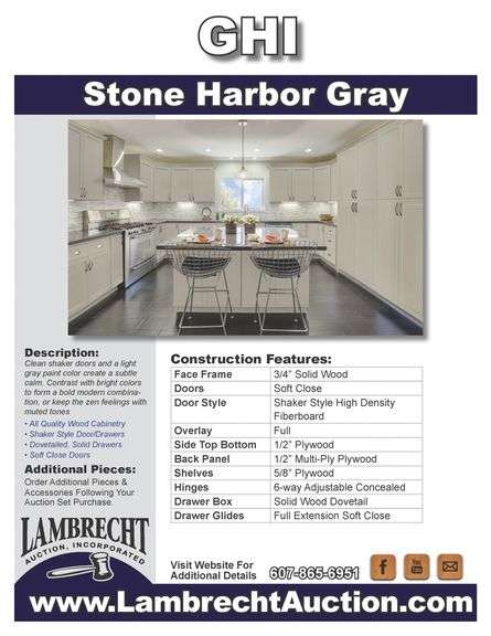 Stone Harbor Gray Kitchen Cabinet Set 12'x15'. Standard Layout, 30" Walls, By GHI, Additional pieces may be available for order to the high bidder. Additional cabinets ship boxed, ready to assemble. -3/4” Solid Wood Face Frame -High Density Fiberboard Shaker Style Door and Drawer Front -1/2” Plywood Box Construction -5/8” Plywood Shelves -Full Overlay Doors and Drawer Fronts -Solid Wood Dovetail Drawer box -Soft Close Full Extension Drawer Gliders -Soft Close Doors -6-Way Adjustable Concealed Hinges. Enclosed in each cabinet set will be a Build Sheet which lists the individual cabinets in each set. As the cabinets are palletized each cabinet will be checked off and signed by our staff member to ensure that the set is complete at the time of pick-up. Please keep this Build Sheet on hand because it will be required if there is an issue with your cabinet set. Cabinet issues will not be addressed without this build sheet. Weight: x. Sold by: Set. Sold as: Price x Quantity.