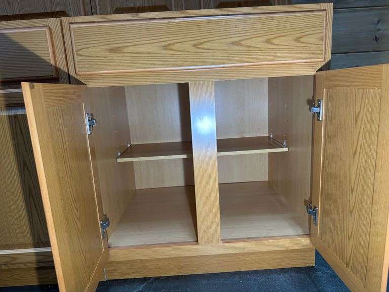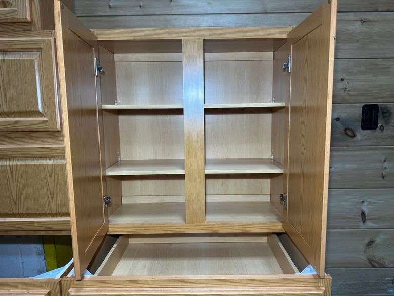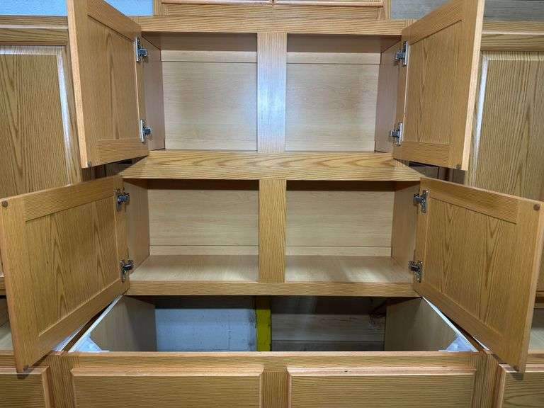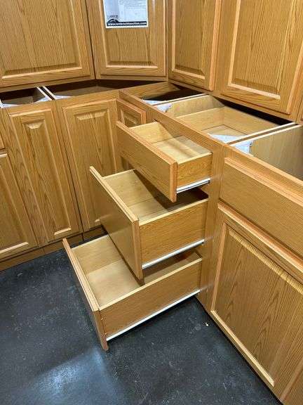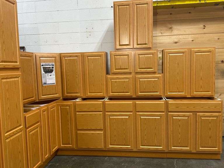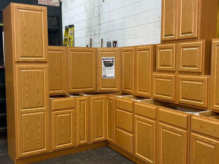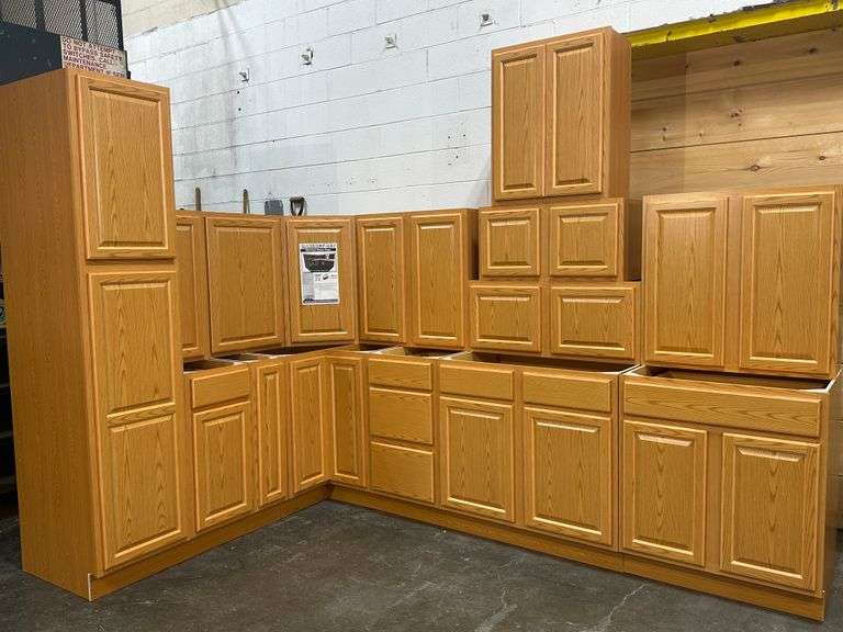 Regal Oak Kitchen Cabinet Set 12'x12'. Classic Layout, 30" Walls, By GHI, Additional pieces may be available for order to the high bidder. Additional cabinets ship boxed, ready to assemble. -All Wood Construction -3/4” Plywood with Veneer Oak Face Frame -Solid Oak Raised Panel Door with Veneer Center Panel -1/2” Plywood Box Construction -5/8” Plywood Shelf -Side Mount Glides and Plywood Drawer Box -Concealed Hinges. Enclosed in each cabinet set will be a Build Sheet which lists the individual cabinets in each set. As the cabinets are palletized each cabinet will be checked off and signed by our staff member to ensure that the set is complete at the time of pick-up. Please keep this Build Sheet on hand because it will be required if there is an issue with your cabinet set. Cabinet issues will not be addressed without this build sheet. Weight: x. Sold by: Set. Sold as: Price x Quantity.