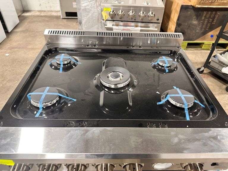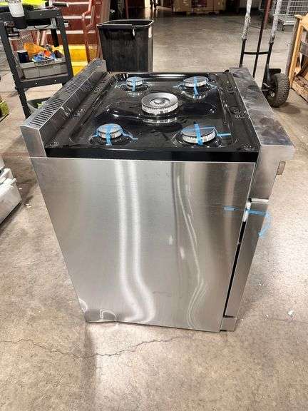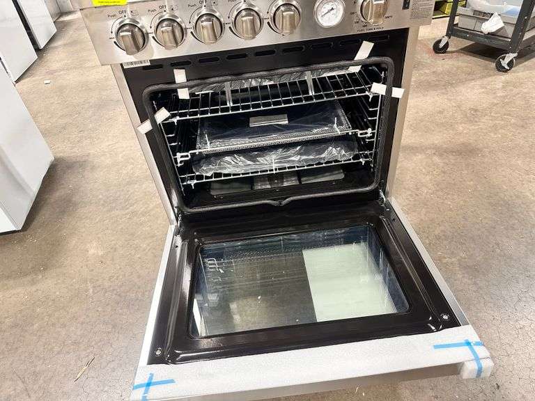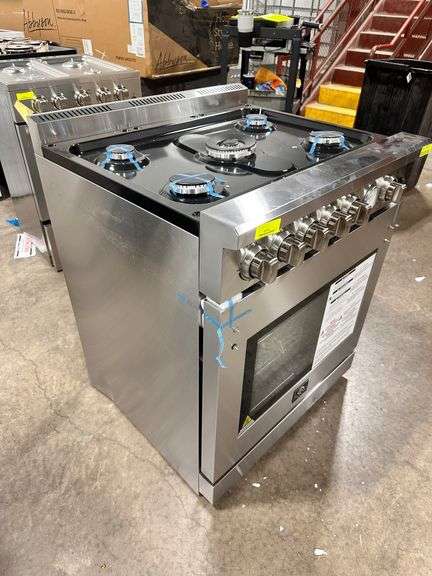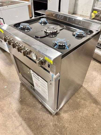 Forno Gas Range FFSGS6276-30 Stainless Steel 30". Missing grates, This is a Forno gas range, model FFSGS6276-30, featuring a stainless steel finish and a 30-inch width. It includes five control knobs for varying burner sizes, a built-in oven with a glass window, and a temperature gauge on the front panel. The unit is designed for natural gas or LPG with specific injector sizes and outputs detailed on the label. The range shows some grade B cosmetic imperfections including dirt, dents on the sides, small dents on the kick plate, and a dent on the rear support. The unit is new but untested. This gas range offers powerful cooking options with burners rated up to 19,000 BTU for wok cooking and an oven rated at 16,000 BTU, making it suitable for home or commercial kitchens looking for versatility and reliability. The stainless steel construction provides durability and an attractive finish that fits modern kitchen designs. This is a liquidated product. The Auction Company makes no express or implied representations or warranties of any kind regarding the Product. Any pre-existing retail, wholesale or manufacturer warranties will not transfer with the sale of this Product unless expressly stated otherwise on this page. The Buyer accepts the Product in as-is condition, with all faults. Weight: . Sold by: Piece. Sold as: Price x Quantity.