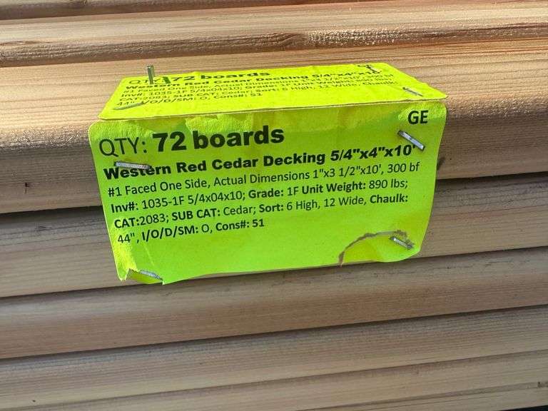 Western Red Cedar Decking 5/4"x4"x10'. #1 Faced One Side, Actual Dimensions: 1"x3 1/2"x10', 300 Board Foot, Grade: 1F, *Condition Note: Chipped Edges, Please See Photos* Weight: 890. Sold by: Board. Sold as: Price x Quantity.