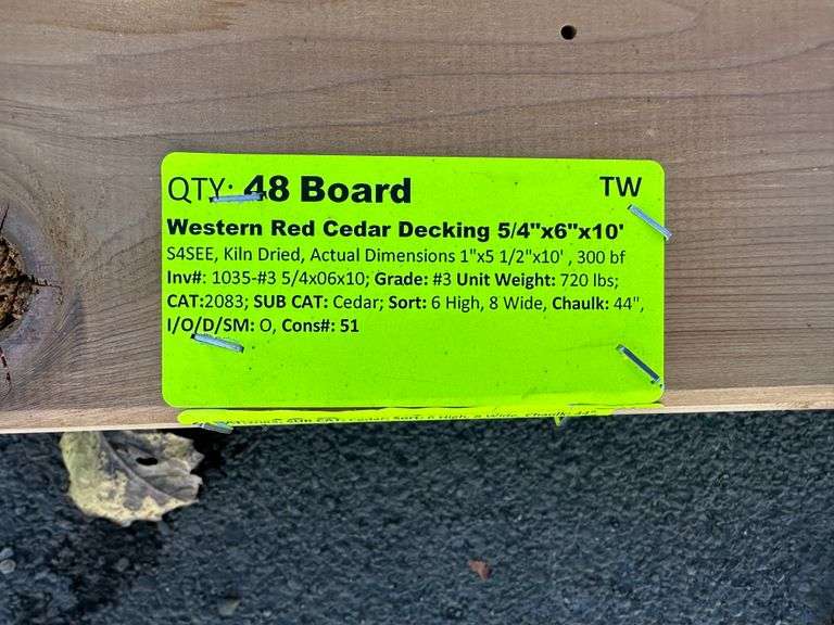 Western Red Cedar Decking 5/4"x6"x10'. S4SEE, Kiln Dried, Actual Dimensions: 1"x5 1/2"x10', 300 Board Foot, Grade: #3 Weight: 720. Sold by: Board. Sold as: Price x Quantity.