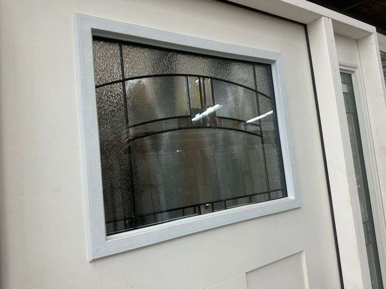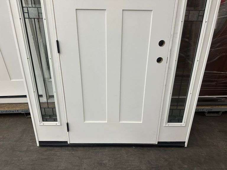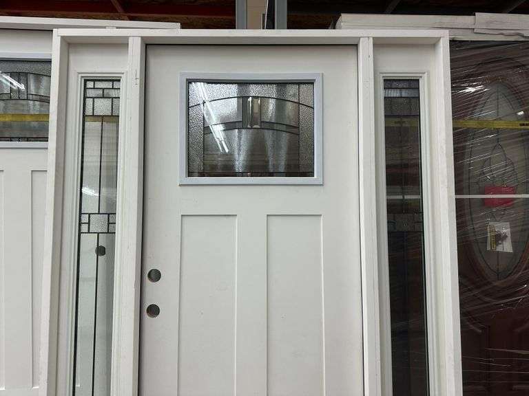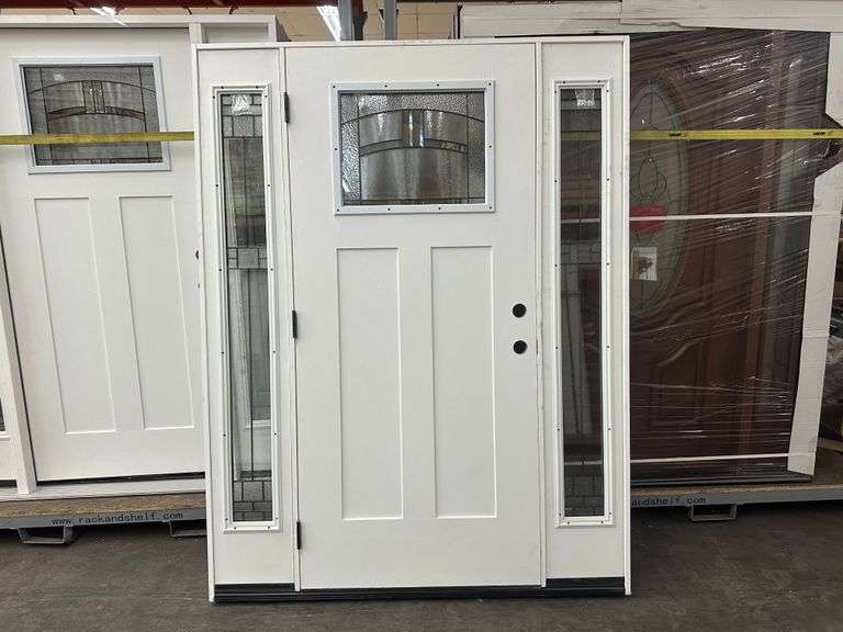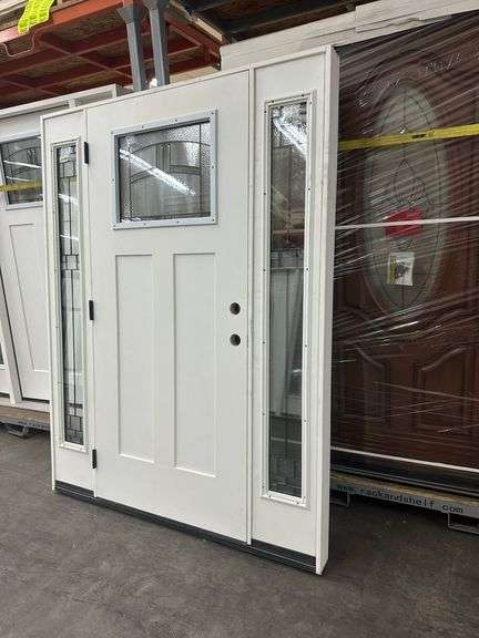 Fiberglass Decorative Entrance Door 2 Side Lights 36"x80" Right Hand. 22"x18" Decorative Glass, Actual Size: 63 3/8"x81 1/2", 4 9/16", Prehung, White, Grade: B Weight: x. Sold by: Door. Sold as: Price x Quantity.