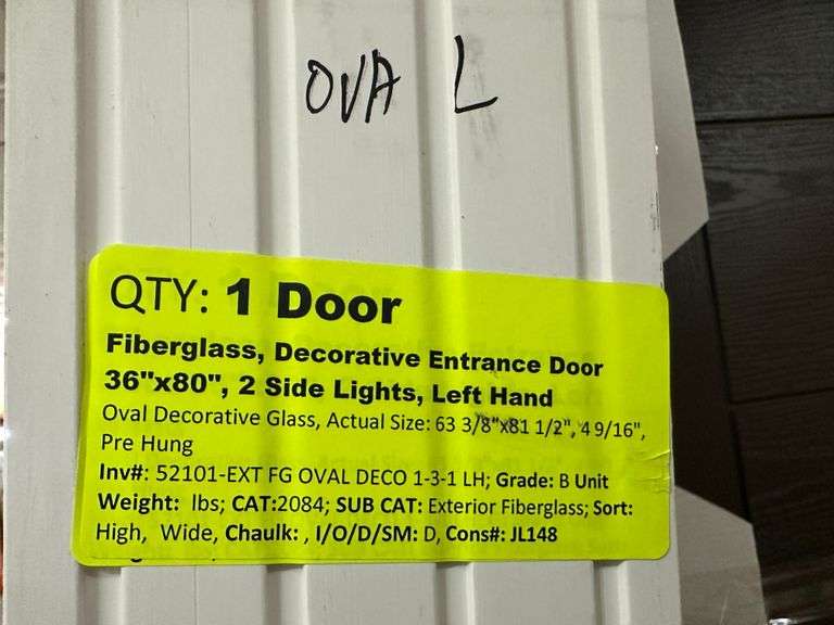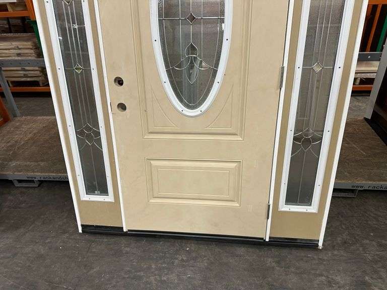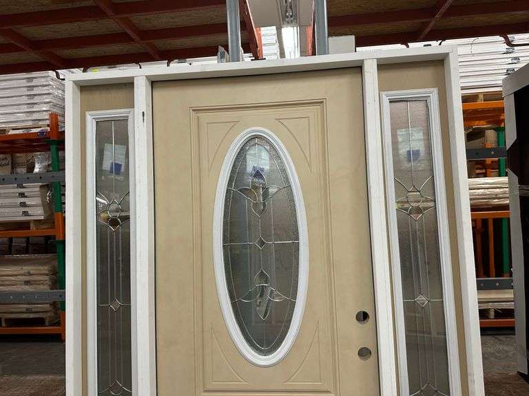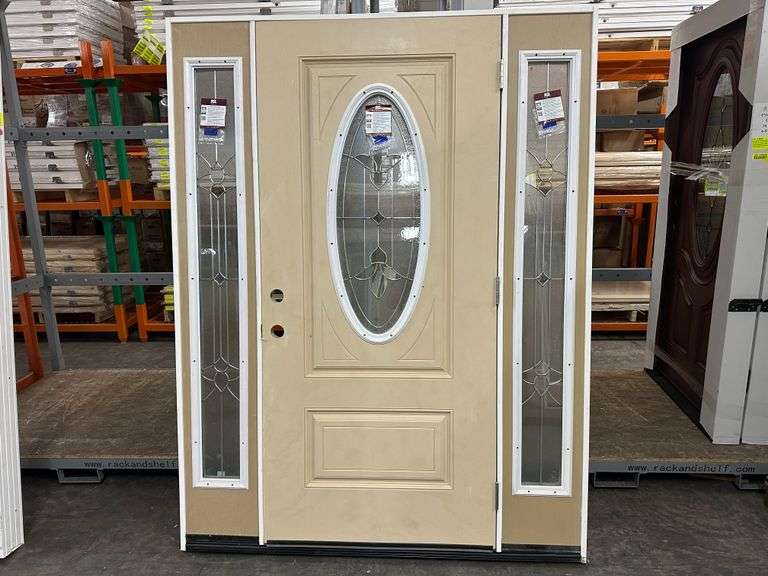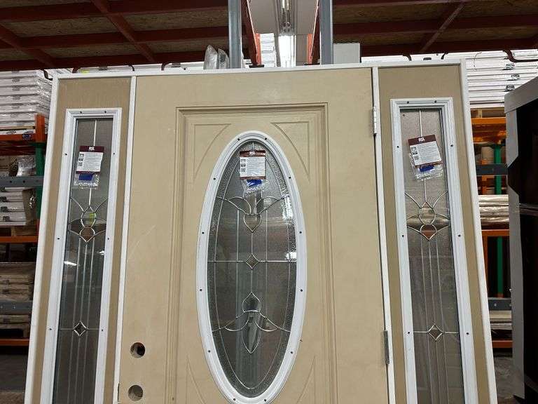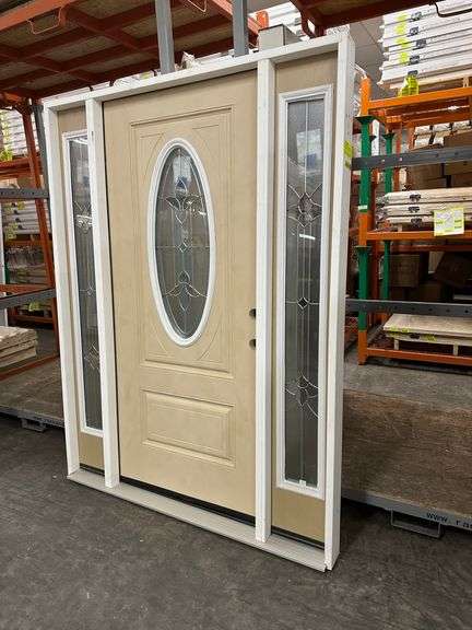 Fiberglass Decorative Entrance Door 2 Side Lights 36"x80" Left Hand. Oval Decorative Glass, Actual Size: 63 3/8"x81 1/2", 4 9/16", Prehung, Light Brown, Grade B Weight: x. Sold by: Door. Sold as: Price x Quantity.