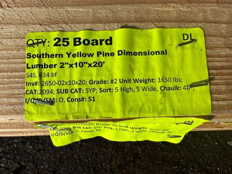 Southern Yellow Pine Dimensional Lumber 2"x10"x20'. S4S, 834 Board Foot, Grade: #2 Weight: 1650. Sold by: Board. Sold as: Price x Quantity.