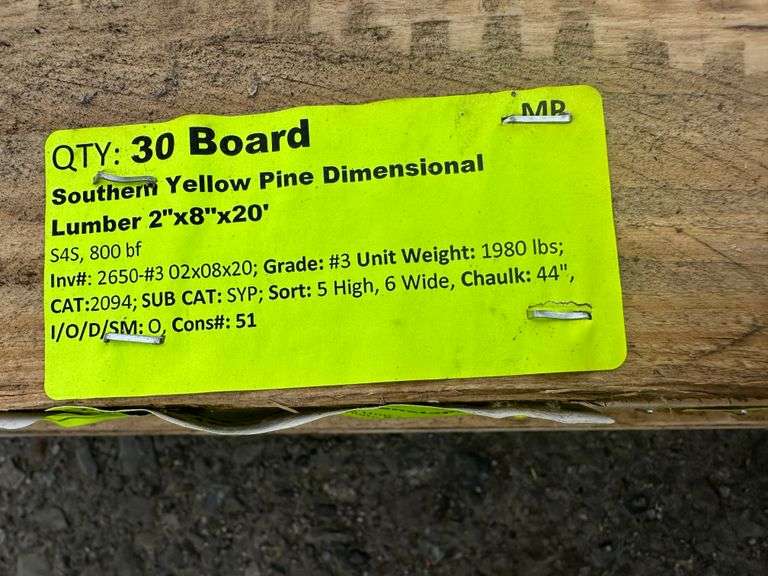 Southern Yellow Pine Dimensional Lumber 2"x8"x20'. S4S, 800 Board Foot, Grade: #3, *Condition Notes: Mold, Splits/Cracks, Please See Photos* Weight: 1980. Sold by: Board. Sold as: Price x Quantity.