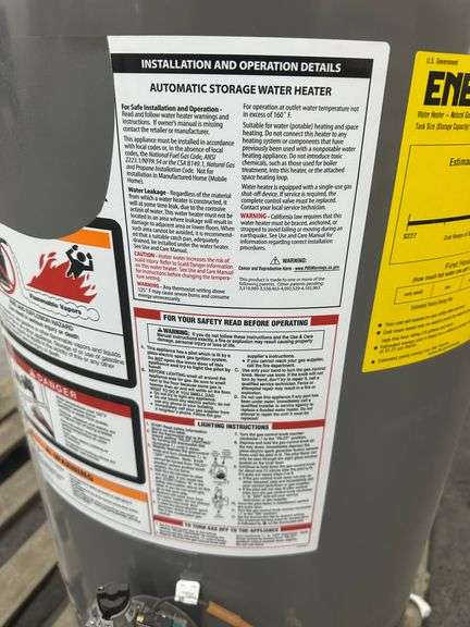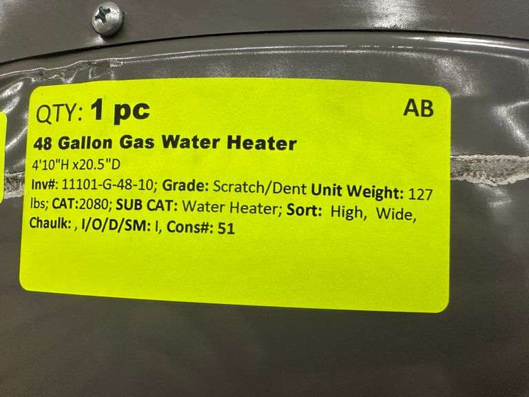 48 Gallon Gas Water Heater. 4'10"Hx20.5"D, Grade: Scratch/Dent, *Condition Note: Minor Dents and Scratches, Please See Photos* Weight: 127. Sold by: Piece. Sold as: Price x Quantity.