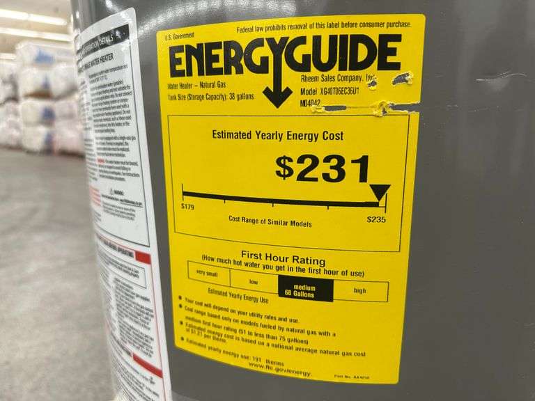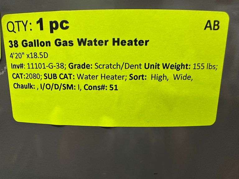 38 Gallon Gas Water Heater. 4'10.5"x18.5"D, Grade: Scratch/Dent, *Condition Note: Minor Dents and Scratches, Please See Photos* Weight: 155. Sold by: Piece. Sold as: Price x Quantity.
