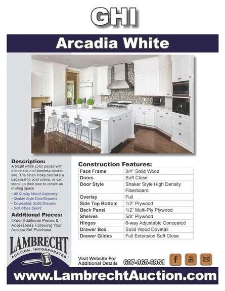 Arcadia White Kitchen Cabinet Set 10'x15'. Deluxe Layout, 30" Walls, By GHI, Additional pieces may be available for order to the high bidder. Additional cabinets ship boxed, ready to assemble. -3/4” Solid Wood Face Frame -High Density Fiberboard Shaker Style Door and Drawer Front -1/2” Plywood Box Construction -5/8” Plywood Shelves -Full Overlay Doors and Drawer Fronts -Solid Wood Dovetail Drawer box -Soft Close Full Extension Drawer Gliders -Soft Close Doors -6-Way Adjustable Concealed Hinges -Additional Wall Cabinets Available in the Following Sizes; 30”, 36”, and 42”; if you would like a different size that what this cabinet is listed as please call our office at 607-865-6951 for a quote. Enclosed in each cabinet set will be a Build Sheet which lists the individual cabinets in each set. As the cabinets are palletized each cabinet will be checked off and signed by our staff member to ensure that the set is complete at the time of pick-up. Please keep this Build Sheet on hand because it will be required if there is an issue with your cabinet set. Cabinet issues will not be addressed without this build sheet. Weight: x. Sold by: Set. Sold as: Price x Quantity.