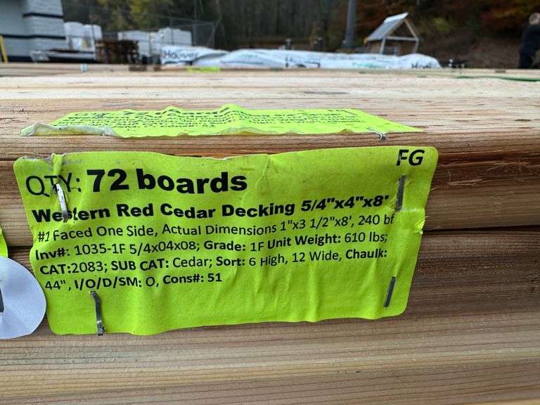 Western Red Cedar Decking 5/4"x4"x8'. #1 Faced One Sie, Actual Dimensions 1"x3 1/2"x8', 240 Board Foot Grade: 1F Weight: 610. Sold by: Board. Sold as: Price x Quantity.
