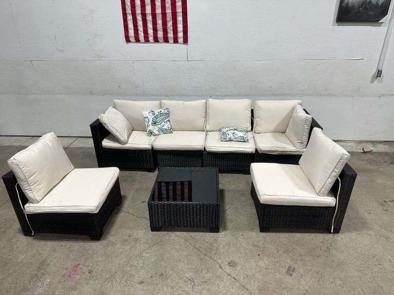7 Piece Wicker Outdoor Patio Furniture Set - Brown & Beige. Brown & Beige style, Two boxes to set, Box A and Box B, 7 Piece set includes 4 piece couch, two chairs and one table Weight: . Sold by: . Sold as: Price x Quantity.