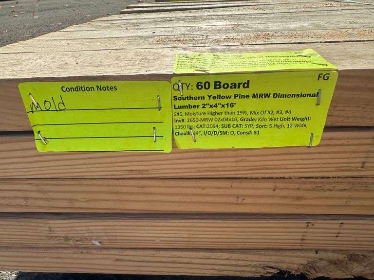 Southern Yellow Pine MRW Dimensional Lumber 2"x4"x16'. S4S, Moisture Higher Than 19%, Mix of #2, #3, #4, Grade: Kiln wet * Condition Note: Mold, Please See Photos * Weight: 1350. Sold by: Board. Sold as: Price x Quantity.