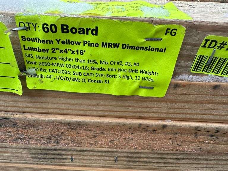 Southern Yellow Pine MRW Dimensional Lumber 2"x4"x16'. S4S, Moisture Higher Than 19%, Mix of #2, #3, #4, Grade: Kiln Wet, *Condition Notes: Mold, Please See Photos* Weight: 1350. Sold by: Board. Sold as: Price x Quantity.