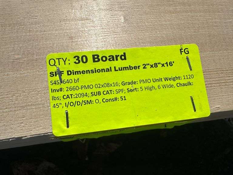 SPF Dimensional Lumber 2"x8"x16'. S4S, 640 Board Foot, Grade: PMO, *Condition Note: Split/Cracked Boards, Please See Photos* Weight: 1120. Sold by: Board. Sold as: Price x Quantity.
