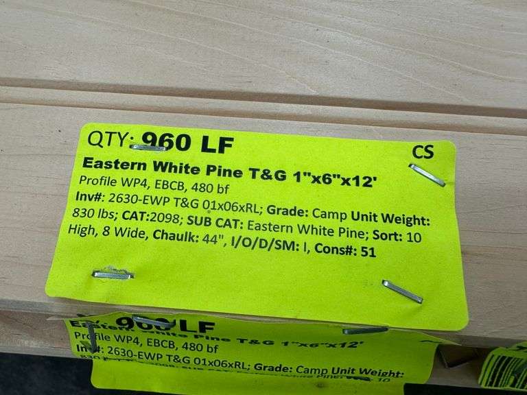 Eastern White Pine T&G 1"x6"x12'. Profile WP4, ECCB, 480 Board Foot Grade: Camp Weight: 830. Sold by: Linear Foot. Sold as: Price x Quantity.