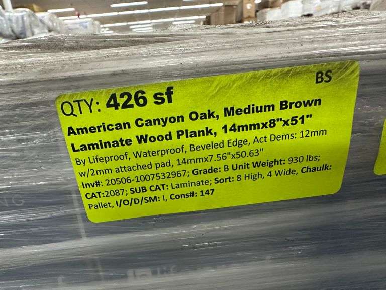 American Canyon Oak Medium Brown Laminate Wood Plank 14MMx8"x51". By Lifeproof, Waterproof, Beveled Edge, Actual Dimensions: 12mm with 2mm Attached Pad, 14MMx7.56"x50.63" Grade: B Weight: 930. Sold by: Square Foot. Sold as: Price x Quantity.