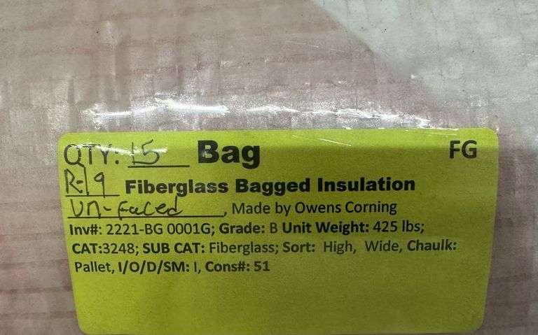 R-19 Unfaced Fiberglass Bagged Insulation. Made by Owens Corning, Grade: B. Weight: 425. Sold by: Bag. Sold as: Price x Quantity.