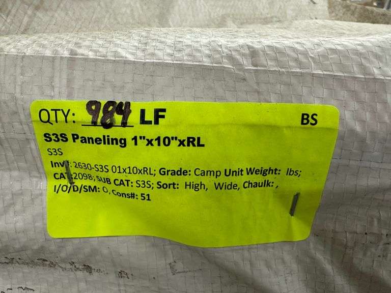 S3S Paneling 1"x10"x8'. S3S, 123 Pieces at 8', Grade: Camp Weight: x. Sold by: Linear Foot. Sold as: Price x Quantity.