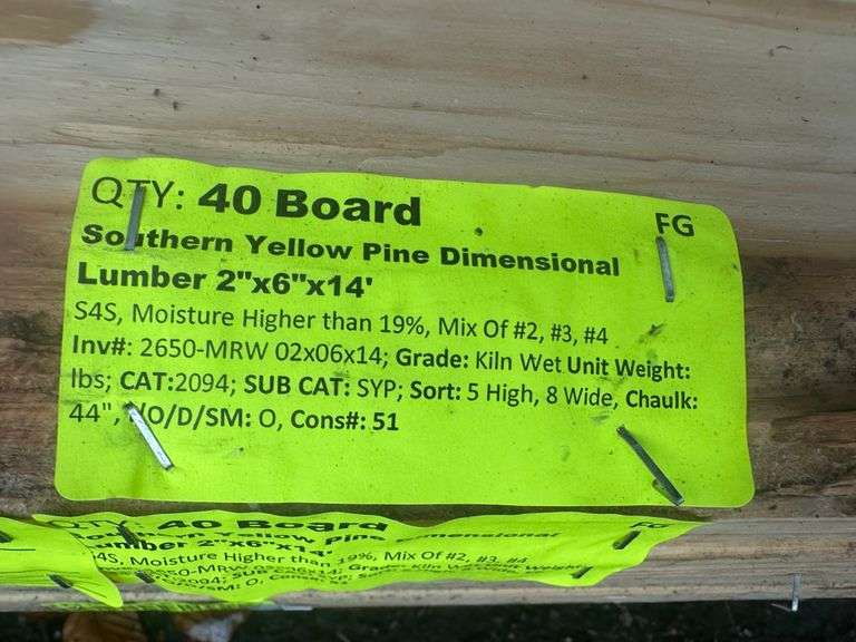 Southern Yellow Pine Dimensional Lumber 2"x6"x14'. S4S, Moisture Higher Than 19%, Mix Of #2, #3, & #4, Grade: Kiln Wet, *Condition Note: Mold, Please See Photos* Weight: x. Sold by: Board. Sold as: Price x Quantity.