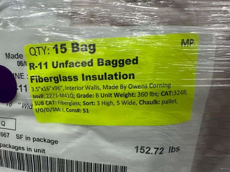 R-11 Unfaced Bagged Fiberglass Insulation. 3.5"x16"x96", Interior Walls, 16 Pieces per Bag, 170.67 Square Foot per Bag. Made by Owens Corning Grade: B Weight: 360. Sold by: Bag. Sold as: Price x Quantity.