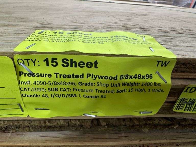 Pressure Treated Plywood 5/8"x48"x96". Grade: Shop *Condition Notes: Delaminated, Unsquare, Please See Photos* Weight: 1400. Sold by: Sheet. Sold as: Price x Quantity.