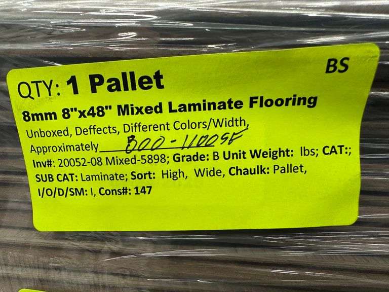 8mmx8"x48" Mixed Laminate Flooring. Unboxed, Approximately: 800-1100 Square Foot, Grade: B *Condition Note: Some Edges may Be Damaged, Please See Photos* Weight: x. Sold by: Pallet. Sold as: Price x Quantity.