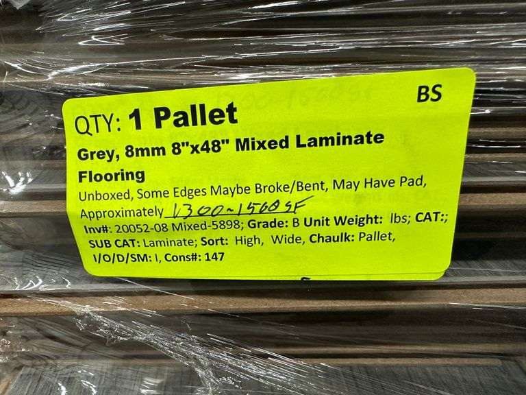 Grey 8mmx8"x48" Mixed Laminate Flooring. Unboxed, Approximately: 1300-1500 Square Foot, Grade: B *Condition Note: Some Edges may Be Damaged, Please See Photos* Weight: x. Sold by: Pallet. Sold as: Price x Quantity.