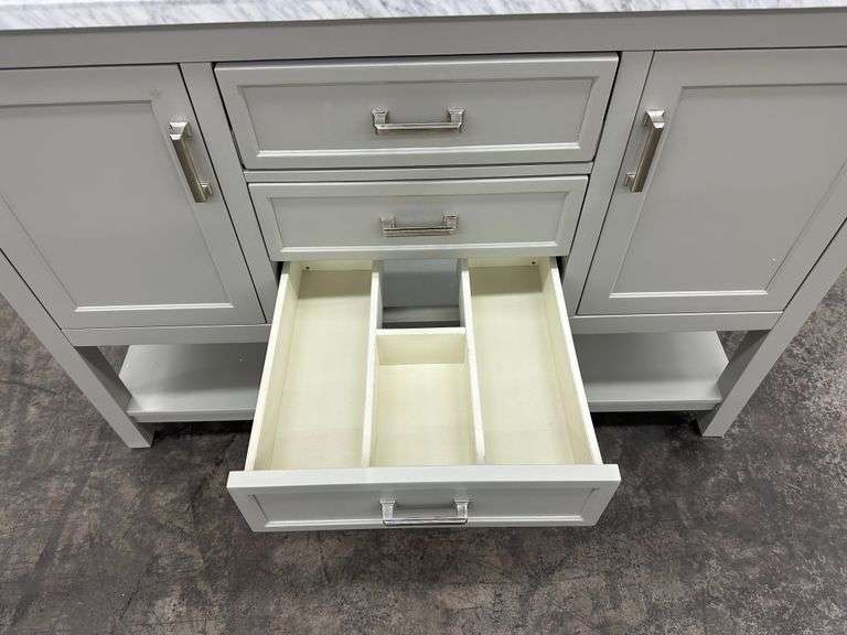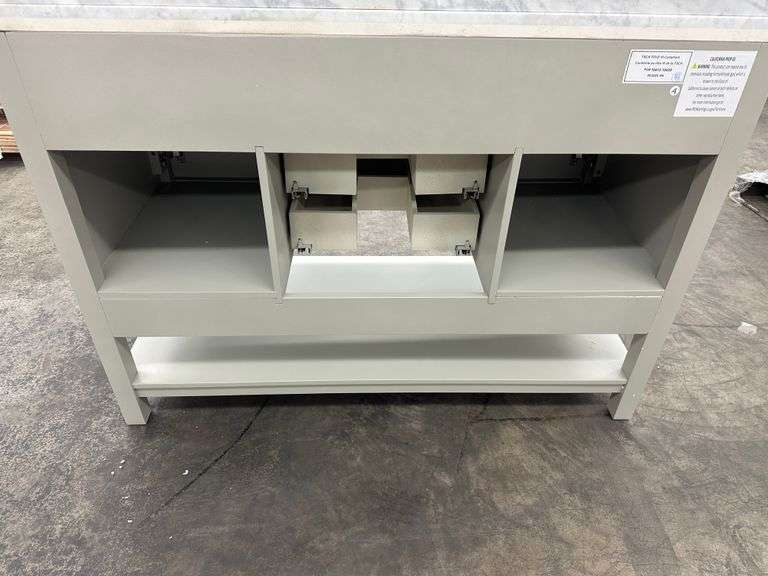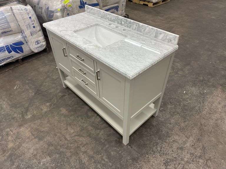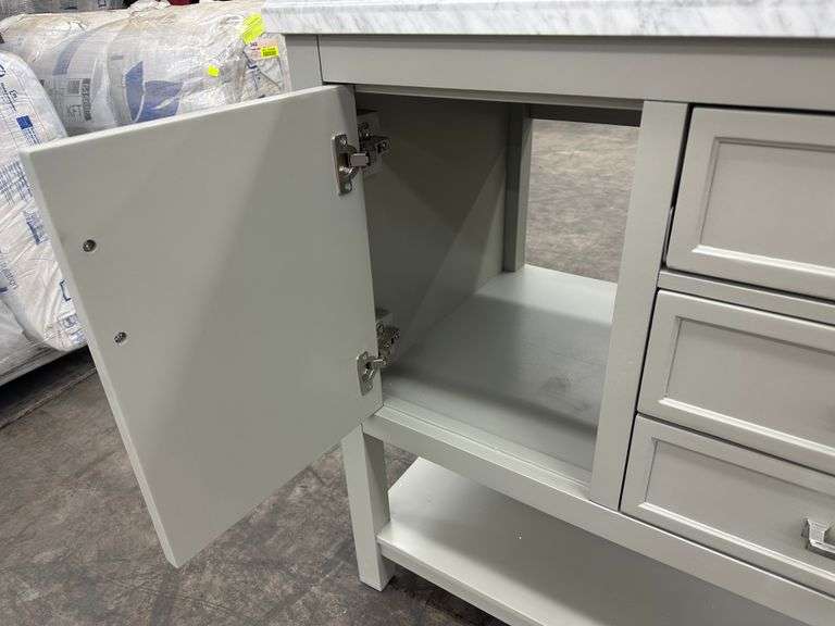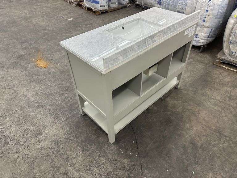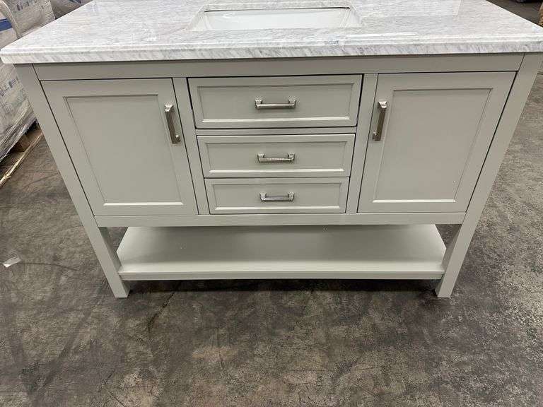Everett Grey Vanity 48". Home Decorators Collection, Gray Bath Vanity With White Carrara Marble Top 49"x22 x36", Grade: 1st Weight: 260. Sold by: Piece. Sold as: Price x Quantity.