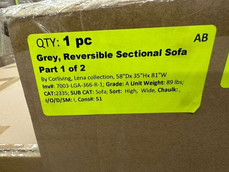 Grey, Reversable Sectional Sofa. Corliving lena collection, 58"Dx 35"Hx 81"W Grade A Weight: 89. Sold by: Piece. Sold as: Price x Quantity.
