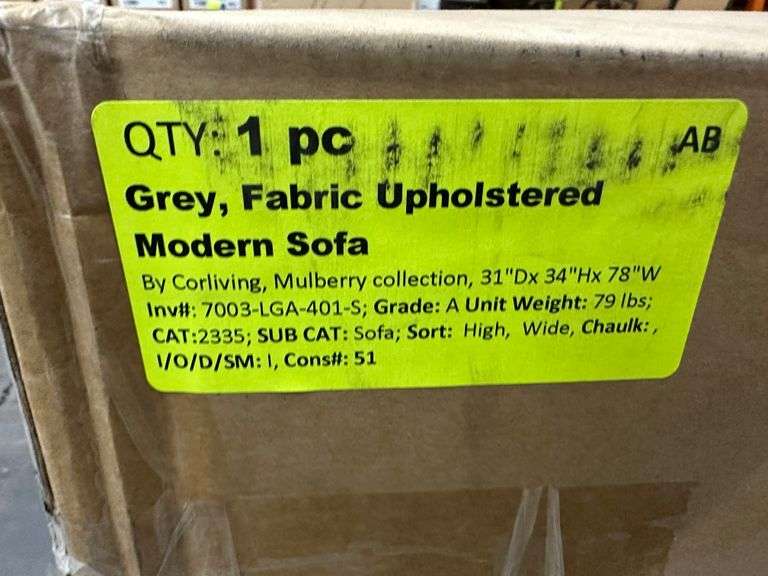 Grey Fabric Upholstered Modern Sofa. By Corliving, Mulberry Collection, 31"D x34"H x78"W, Grade: A Weight: 79. Sold by: Piece. Sold as: Price x Quantity.