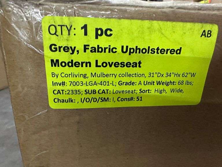 Gray Fabric Upholstered Modern Loveseat. By Corliving, Mulberry Collection, 31"Dx 34"Hx 62W, Grade: A Weight: 68. Sold by: piece. Sold as: Price x Quantity.