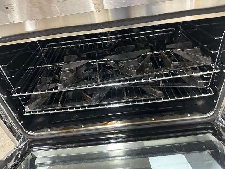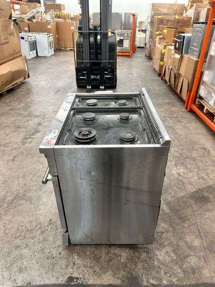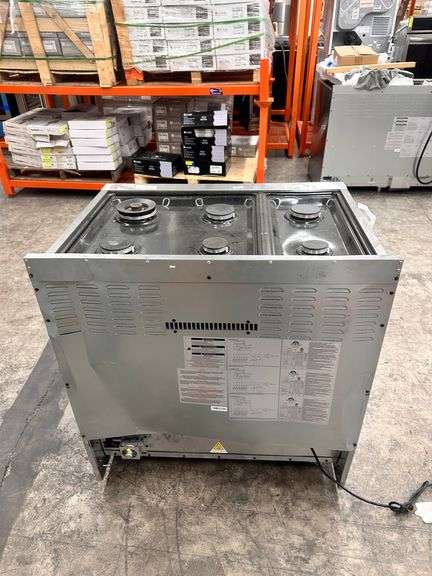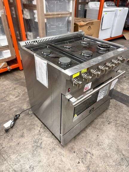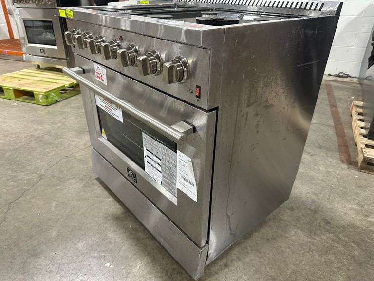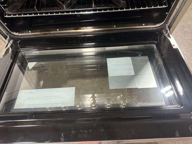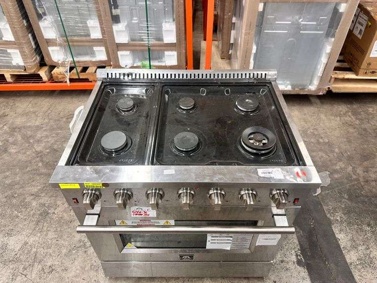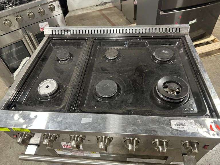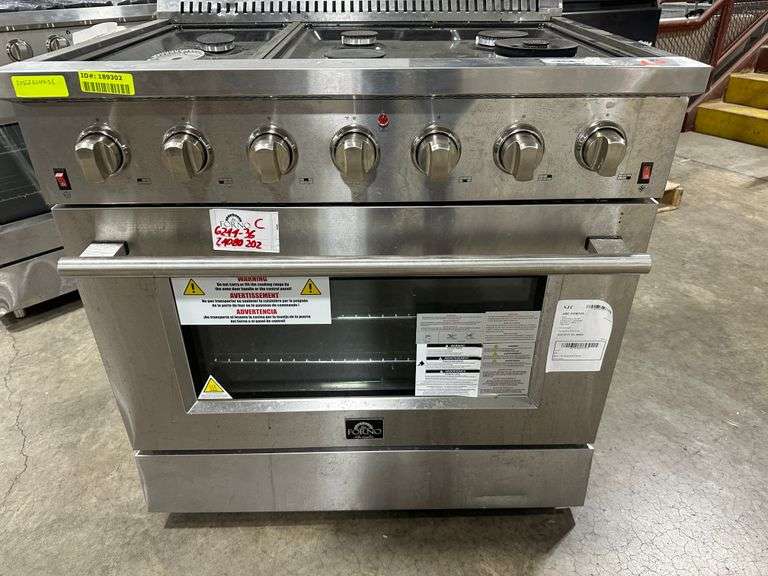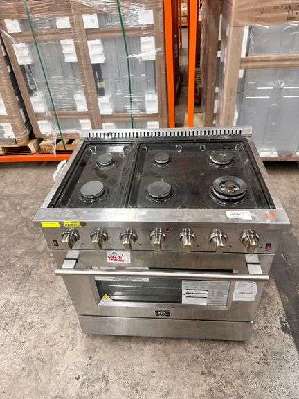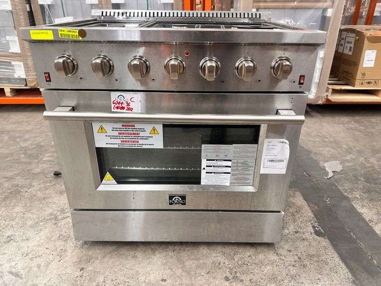 FORNO Galiano 36" 5.36 cu. ft. Gas Range with 6 Italian Burners. 36" W x 28.94" D x 37.7" H. Back panel is dented. Front kick plate is loose. One back leg is bent. Used and dirty. Front panel is dented. Weight: . Sold by: . Sold as: Price x Quantity.