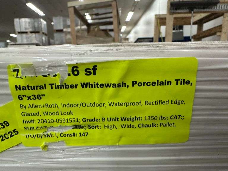 Natural Timber Whitewash Porcelain Tile 6"x36". By Allen + Roth, Indoor/Outdoor, Waterproof, Rectified Edge, Glazed, Wood Look Grade: B Weight: 2200. Sold by: Square Foot. Sold as: Price x Quantity.
