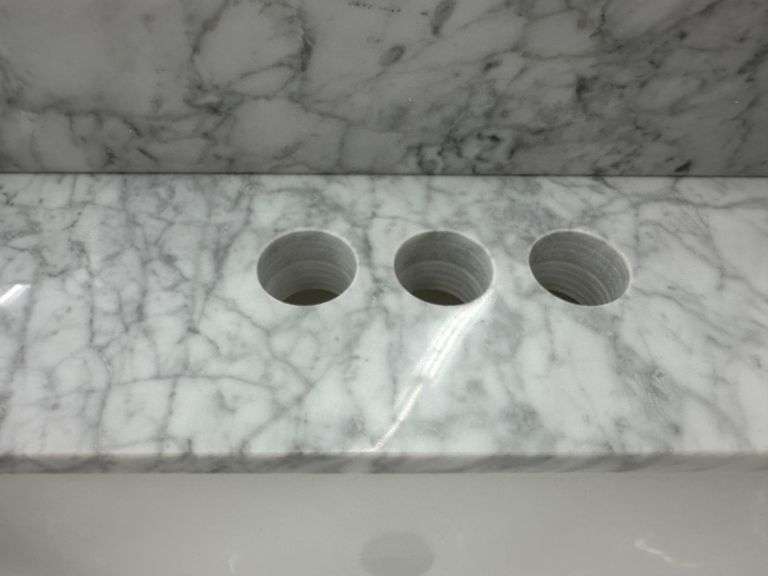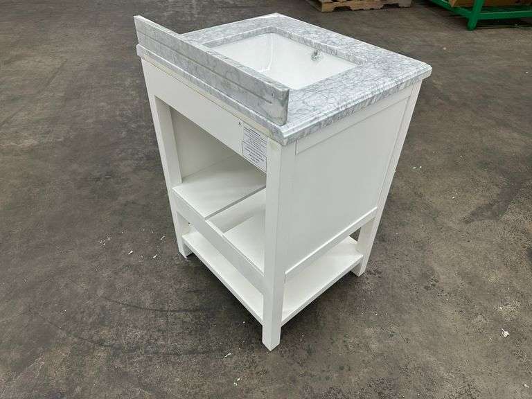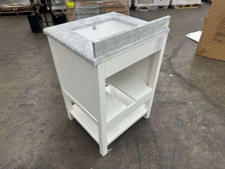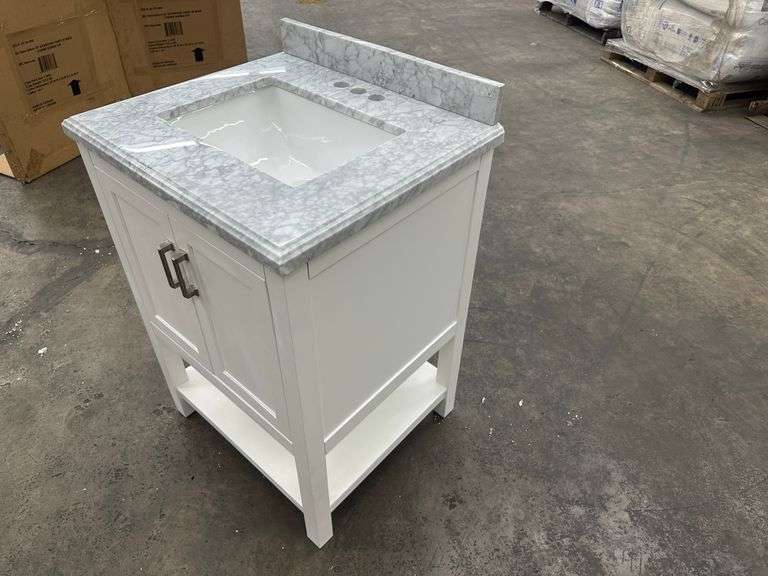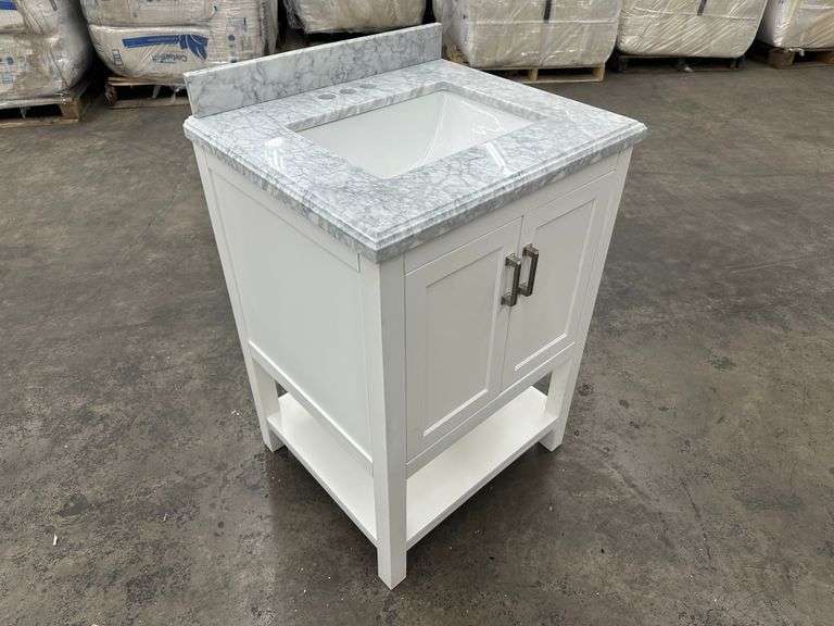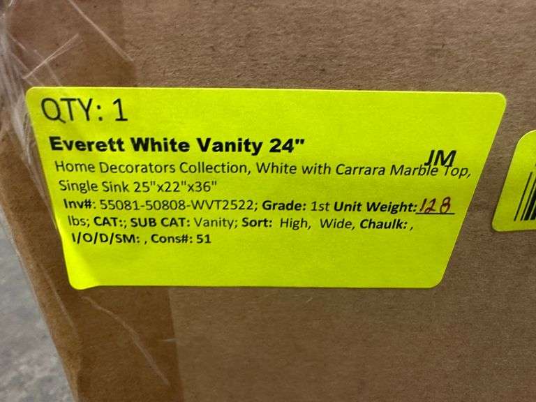 Everett White Vanity 24". Home Decorators Collection, White With Carrara Marble Top, Single Sink 25"x22"x36", Grade: 1st Weight: 128. Sold by: Piece. Sold as: Price x Quantity.