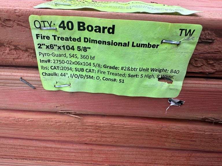 Fire Treated Dimensional Lumber 2"x6"x104 5/8". Pyro-Guard, S4S, 360 Board Foot, Grade: #2&btr Weight: 840. Sold by: Board. Sold as: Price x Quantity.