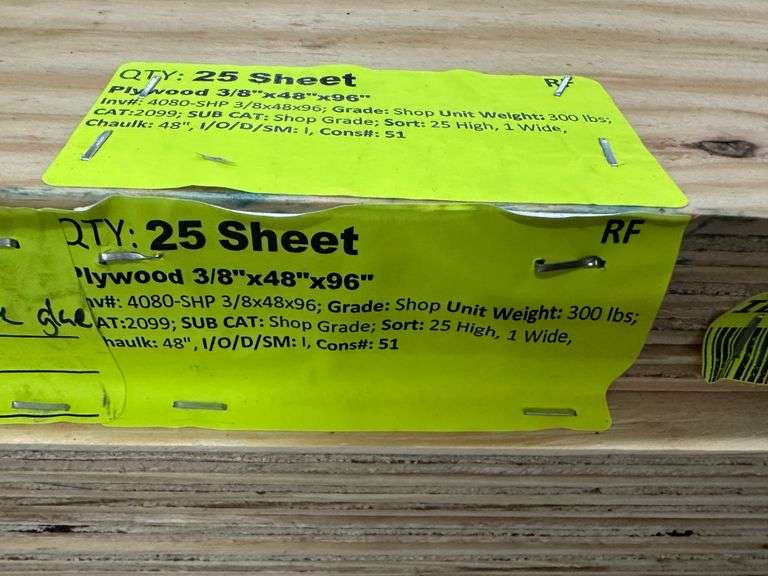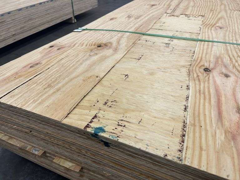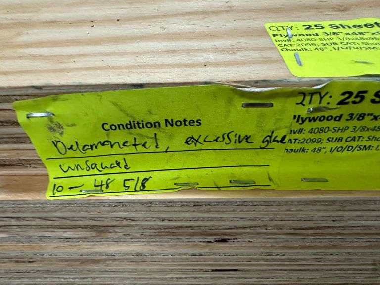 Plywood 3/8"x48"x96" and 3/8"x48 5/8"x96. Grade: Shop. *Condition Note: Delaminated, Excess Glue, 10 Pieces at 48 5/8" Thickness. Please See Photos.* Weight: 300. Sold by: Sheet. Sold as: Price x Quantity.