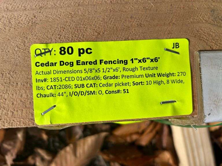 Cedar Dog Eared Fencing 1"x6"x6'. Actual Dimension: 5/8"x5 1/2"x6', Rough Texture, Grade: Premium Weight: 270. Sold by: Piece. Sold as: Price x Quantity.