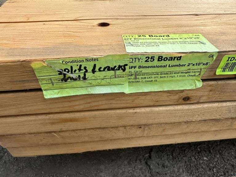 SPF Dimensional Lumber 2"x10"x8'. S4S, 334 Board Foot, Grade: #3 *Condition Note: Splits/Cracks, Mold, Please See Photos* Weight: 540. Sold by: Board. Sold as: Price x Quantity.