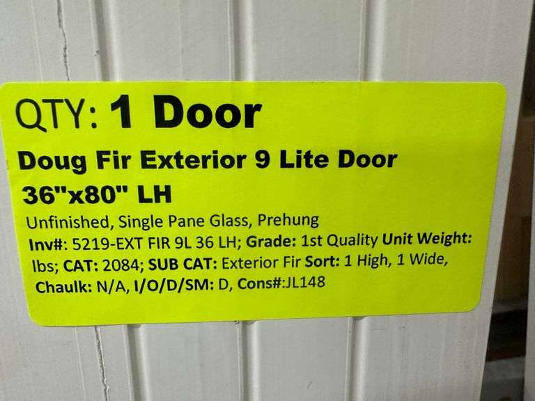 Doug Fir Exterior 9 Lite Door 36"x 80" LH. Unfinished, Single Pane Glass, Prehung, Grade: 1st Quality Weight: x. Sold by: Door. Sold as: Price x Quantity.