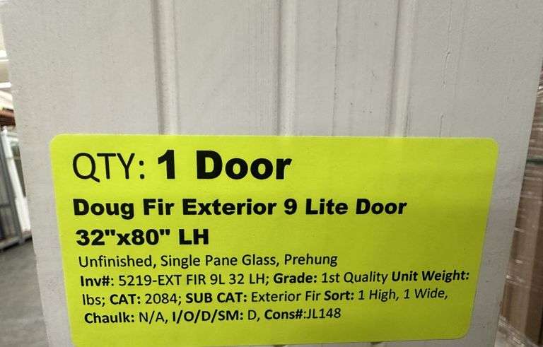 Doug Fir Exterior 9 Lite Door 32"x80" LH. Unfinished, Single Pane Glass, Prehung, Grade: 1st Quality Weight: x. Sold by: Door. Sold as: Price x Quantity.