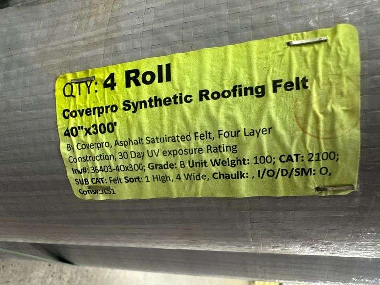 Coverpro Synthetic Roofing Felt 40"x300'. By Coverpro, Asphalt Saturated Felt, Four Layer Construction, 30 day UV Exposure Rating, Grade: B Weight: 100. Sold by: Roll. Sold as: Price x Quantity.