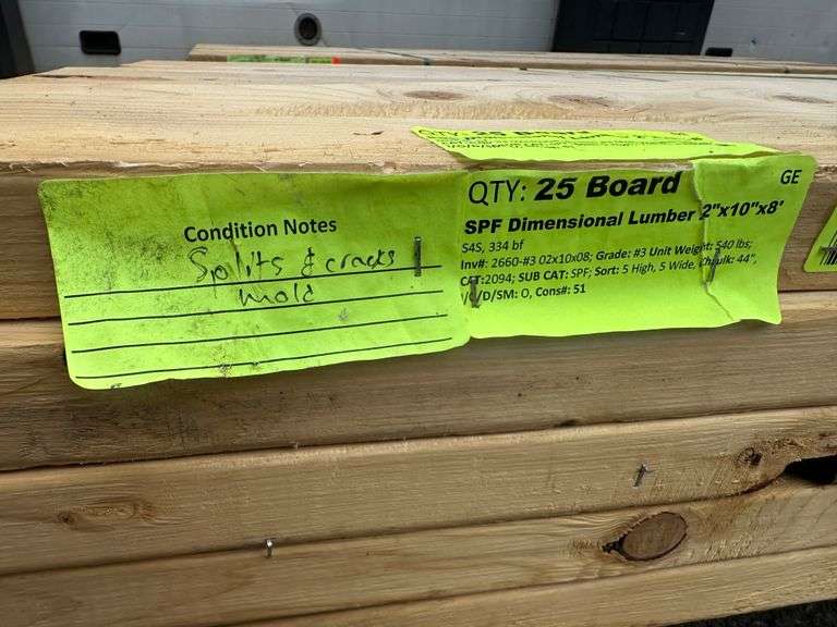 SPF Dimensional Lumber 2"x10"x8'. S4S, 334 Board Foot, Grade: #3 *Condition Note: Splits/Cracks, Mold, Please See Photos* Weight: 540. Sold by: Board. Sold as: Price x Quantity.