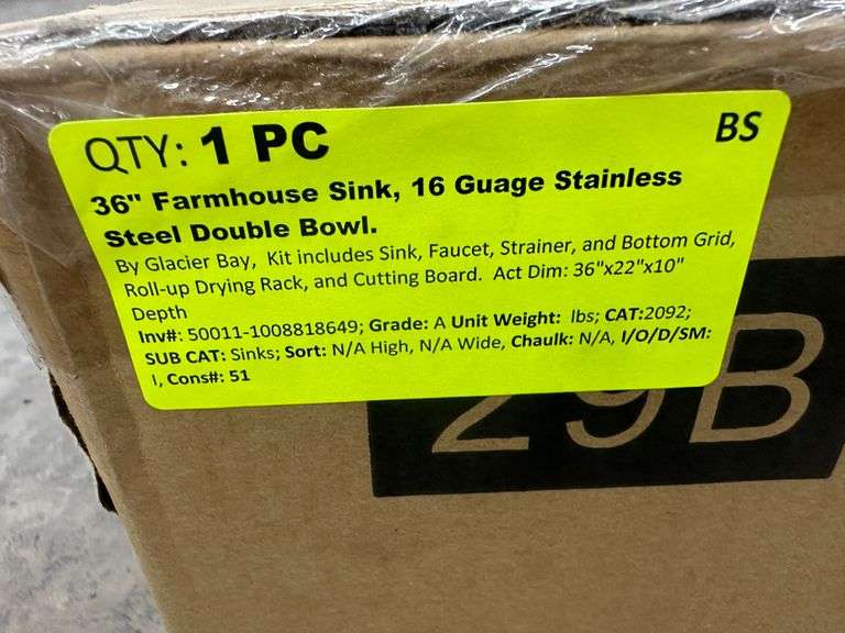 36" Farmhouse Sink 16 Gauge Stainless Steel Double Bowl. By Glacier Bay, Kit Includes Sink, Faucet, Strainer, and Bottom Grid, Roll-up Drying Rack, and Cutting Board. Actual Dimensions: 36"x22"x10" Depth, Grade: A Weight: x. Sold by: Piece. Sold as: Price x Quantity.