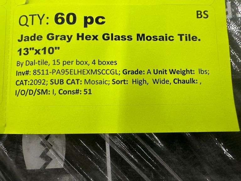 Jade Gray Hex Glass Mosaic Tile 13"x10". By Dal-tile, 15 per box, 4 Boxes, Grade: A Weight: x. Sold by: Piece. Sold as: Price x Quantity.
