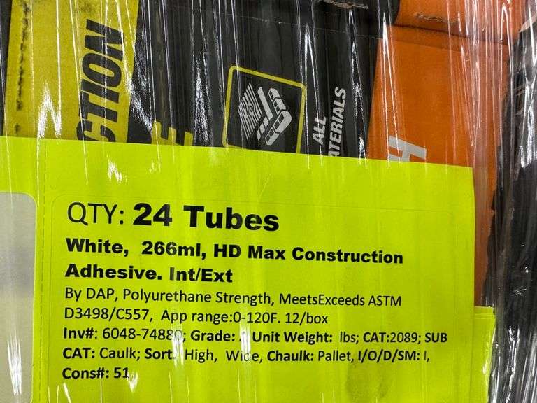 White 266ml HD Max Construction Adhesive Interior/Exterior. By: DAP, Polyurethane Strength, Meets/Exceeds ASTM D3498/C557, Application Range: 0-120F 12 Per Box, 2 Boxes, Grade: A Weight: x. Sold by: Tube. Sold as: Price x Quantity.