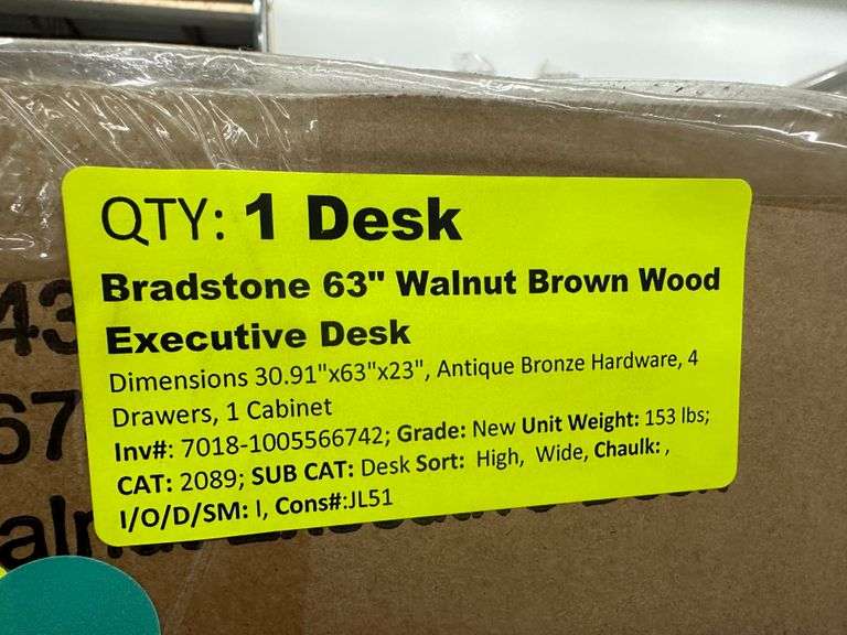 Bradstone 63" Walnut Brown Wood Executive Desk. Dimensions 30.91"x63"x23", Antique Bronze Hardware, 4 Drawers, 1 Cabinet Weight: 153. Sold by: Piece. Sold as: Price x Quantity.