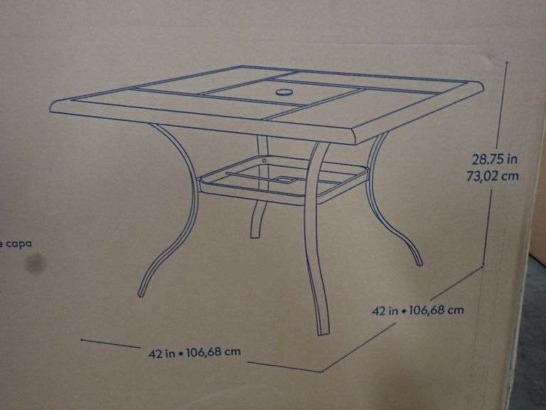 Black Skytop Outdoor Dining Table 28 3/4" x42"x 42". By Style Selections, Heavy-Duty Steel Frame, Powder Coated Finish, Hand-Brushed Wood Grain Steel Top, Seats 4 People, Grade: A. Weight: 60. Sold by: Piece. Sold as: Price x Quantity.