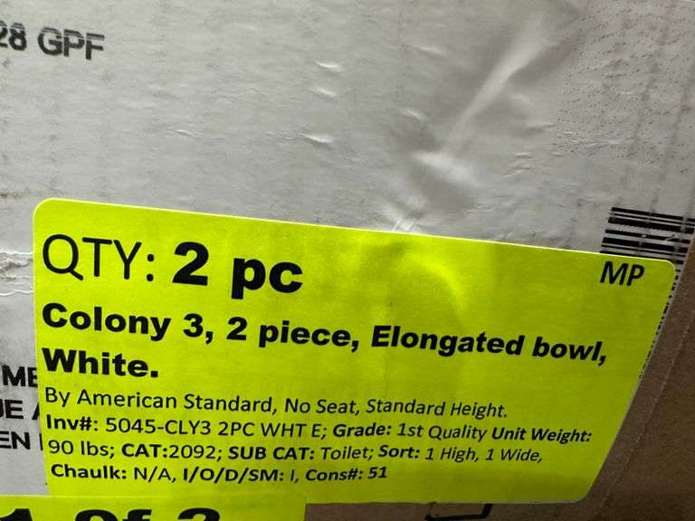 Colony 3 2 Piece Elongated Bowl White. By: American Standard, No Seat, Standard Height, 12" Tank Reservoir With Liner, Grade: 1st Quality Weight: 90. Sold by: Piece. Sold as: Price x Quantity.