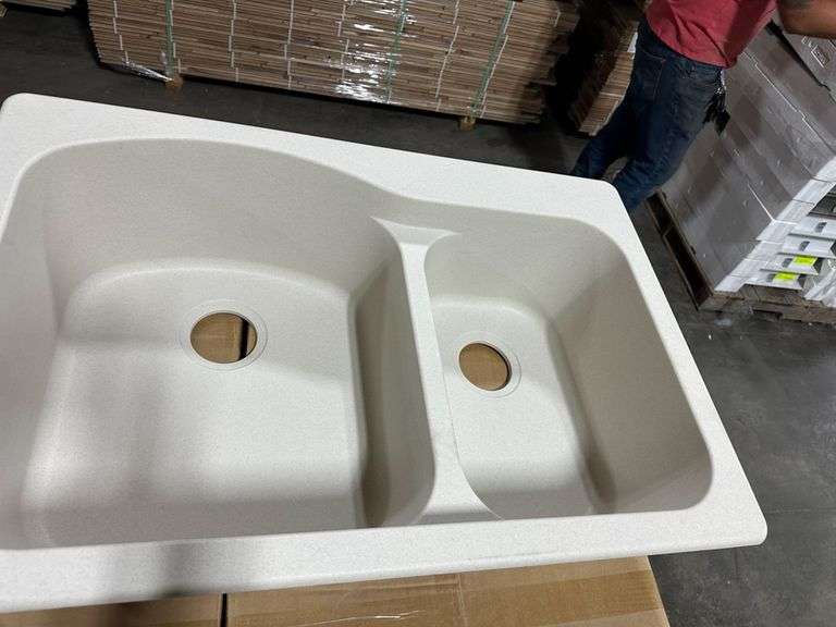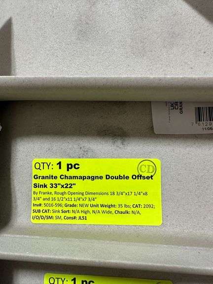 Granite Champagne Double Offset Sink 33"x22". By Franke, Rough Opening Dimensions 18 3/4"x17 1/4"x8 3/4" and 16 1/2"x 11 1/4"x7 3/4", Grade: NEW Weight: 35. Sold by: Piece. Sold as: Price x Quantity.